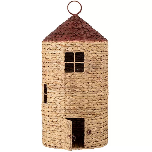 De ronde, handgeweven poppenhuismand is voorzien van twee ramen en een deurtje dat sluit met een knoop en lusje.