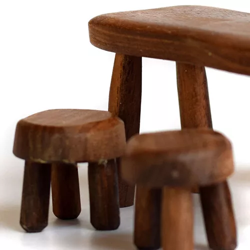 De poppenfamilie kan gezellig samen aan tafel met deze handgemaakte eetkamerset van het Roemeense merk Bumbu Toys. Een robuuste, houten speelgoedeettafel met vier krukjes voor een sfeervol poppenhuis met landelijk interieur.