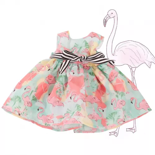 Een zomerse poppenjurk ‘Flamingo’ van het Duitse merk Götz versiert met flamingos en een zwart witte strik.