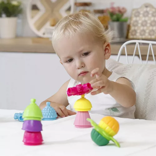 Dit speelgoed laat jonge kinderen kennismaken met vormen en kleuren, met klikken, draaien, mixen en stapelen. De klikkralen hebben geen vast doel, maar prikkelen de zintuigen van kinderen om te ontdekken en bieden ruimte aan de verbeelding voor fantasierijke vormen.