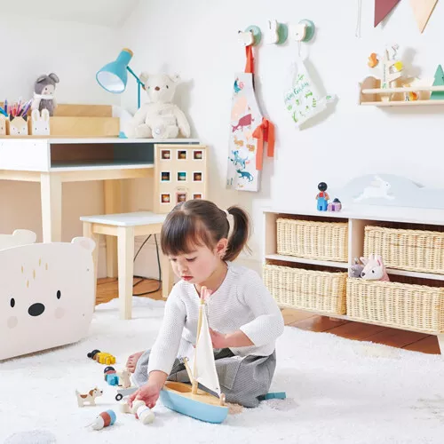 Schip ahoy! Een traditionele zeilboot ‘Sailaway’ van het Amerikaanse merk Tender Leaf Toys voor zomerse avonturen op zee.
