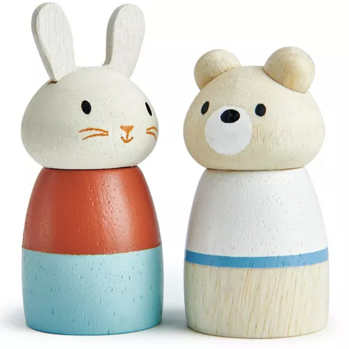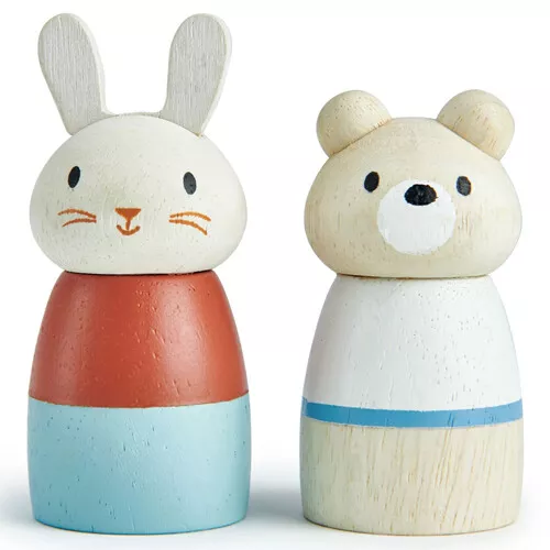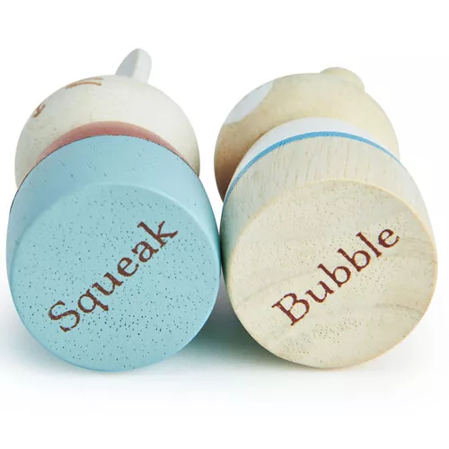 Deze massief houten speelgoedboot heeft twee stoffen zeilen met een vlaggenlijn en wordt bestuurd door twee doorgewinterde zeekapiteinen: Bubble en Squeak!