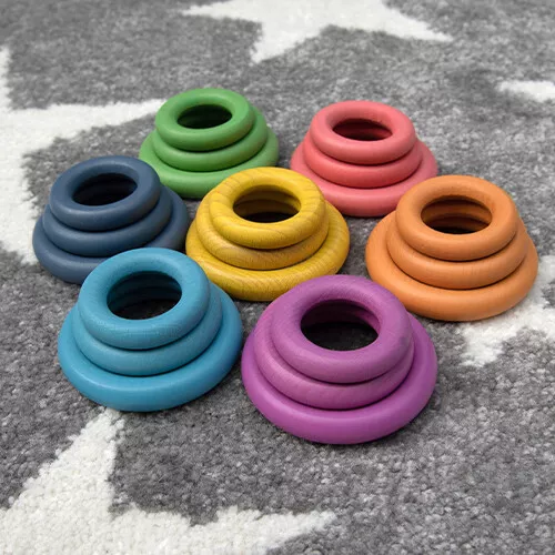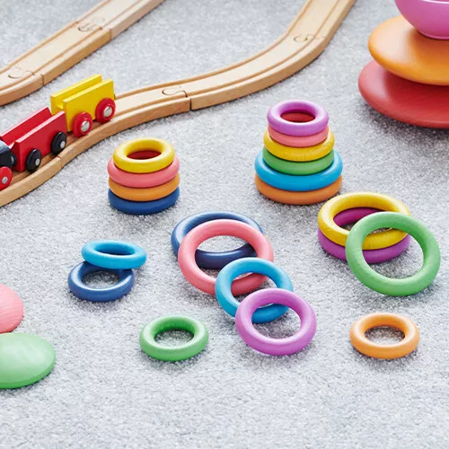 Met de speelgoedringen, in drie verschillende formaten en zeven kleuren, zijn vrolijke stapeltorens te bouwen of patronen te leggen. Maar kinderen leren ook tellen, sorteren en kleuren herkennen.
