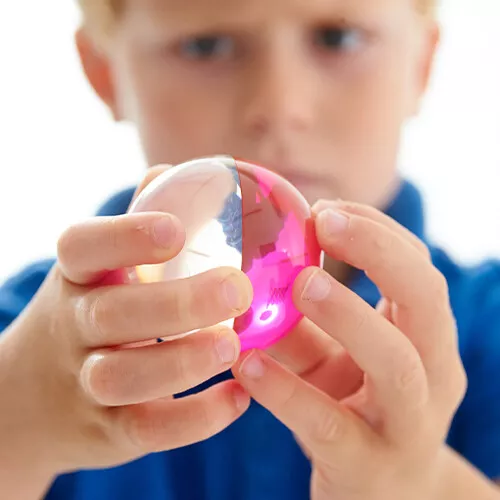 Houd verschillende kleuren tegen elkaar, zodat er nieuwe kleuren ontstaan en gebruik de halve bollen met een zaklamp, lichtbak of in de zon voor een verrassend effect.