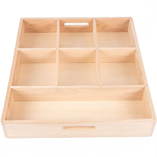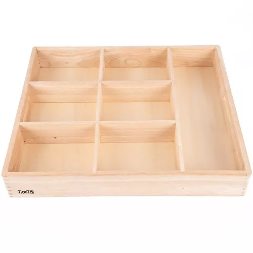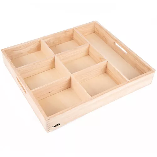 Sorteer blokjes, vormen en speelfiguren in deze houten sorteerbak van het Engelse merk Tickit. Gebruik de speelbak met zeven vakken om te leren tellen en sorteren; bijvoorbeeld met de blokjes en figuurtjes van Tickit of om de mooiste schatten tentoon te stellen.