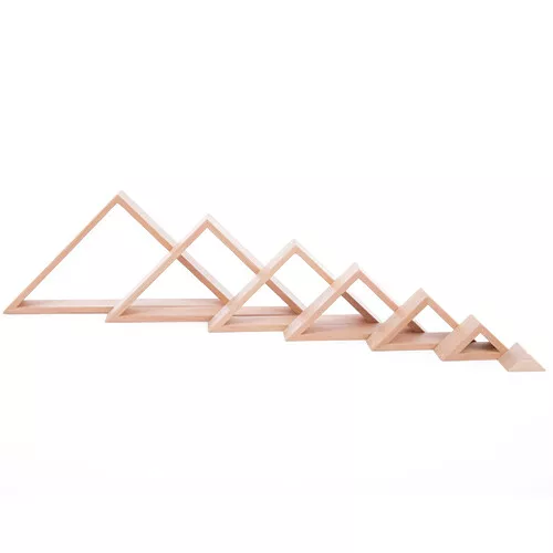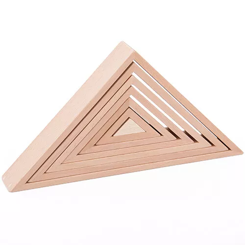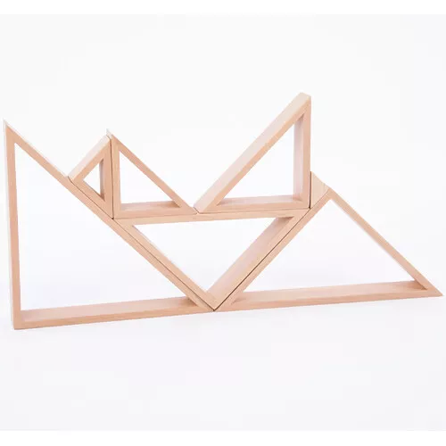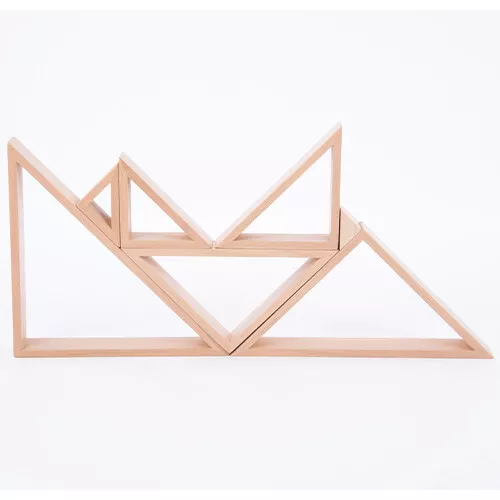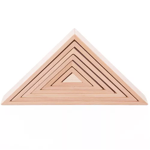 Het stapelspeelgoed, mooi uitgevoerd in naturel hout, bestaat uit zeven driehoeken, die op en in elkaar passen. De geometrische vormen kunnen op diverse manieren gestapeld worden om mooie bouwwerken te maken. Dat vraagt enige creativiteit en zoeken naar evenwicht.