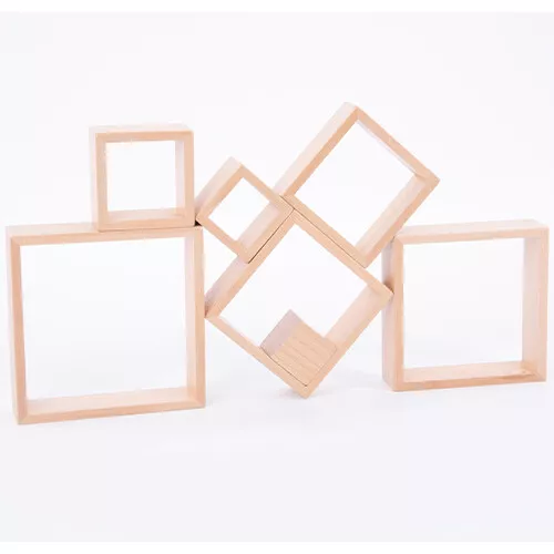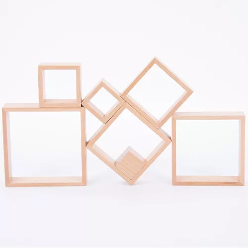 Combineer de vierkanten met de andere meetkundige stapelvormen uit de Wooden Architect serie van Tickit.