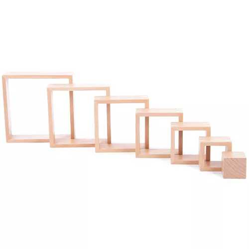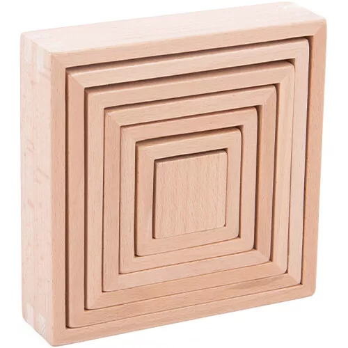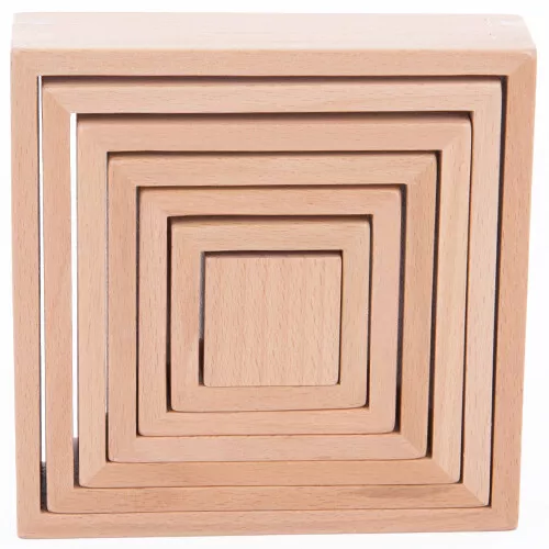 Het stapelspeelgoed, mooi uitgevoerd in naturel hout, bestaat uit zeven vierkanten, die op en in elkaar passen. De geometrische vormen kunnen op diverse manieren gestapeld worden om mooie bouwwerken te maken. Dat vraagt enige creativiteit en zoeken naar evenwicht.